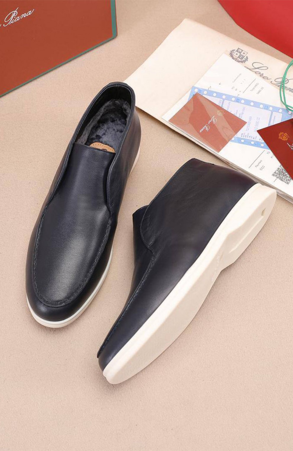 Кожаные лоферы с мехом Loro Piana Open Walk - Navy