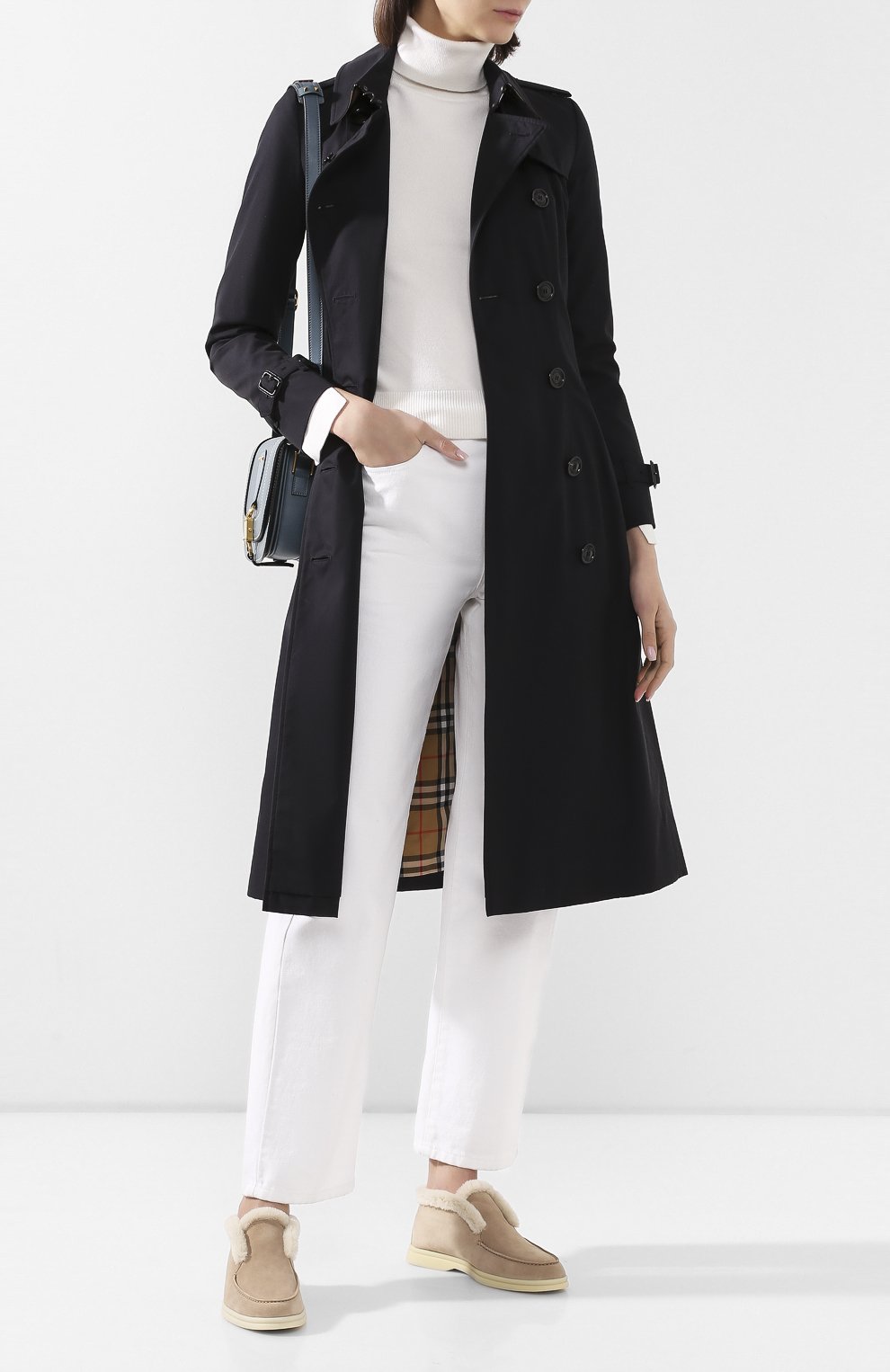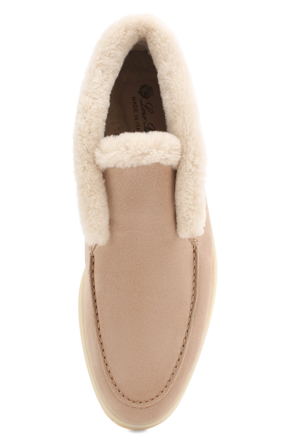 Темно-бежевые ботинки Open Walk из весенне-летней коллекции 2020 года составят хорошую компанию образу для прогулки в прохладную погоду. Мастера марки, основанной Пьетро Лоро Пьяна, сшили обувь из мягкой бархатистой замши. Материал покрыли водоотталкивающей пропиткой, а внутреннюю часть утеплили отделкой из короткого густого меха нутрии.
