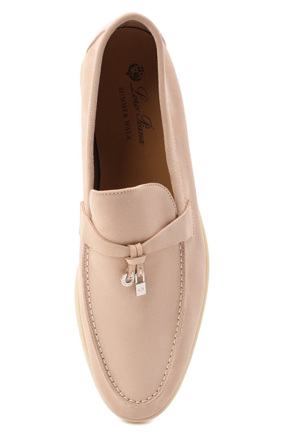 Лоферы Summer Charms Walk пастельно-розового цвета особенно мягкие и комфортные. На это работает как тонкая бархатистая замша, так и отсутствие внутренней отделки, за счет чего обувь садится точно по ноге. Модель из осенне-зимней коллекции марки, основанной Пьетро Лоро Пьяна, украшена небольшими подвесками My Charms.