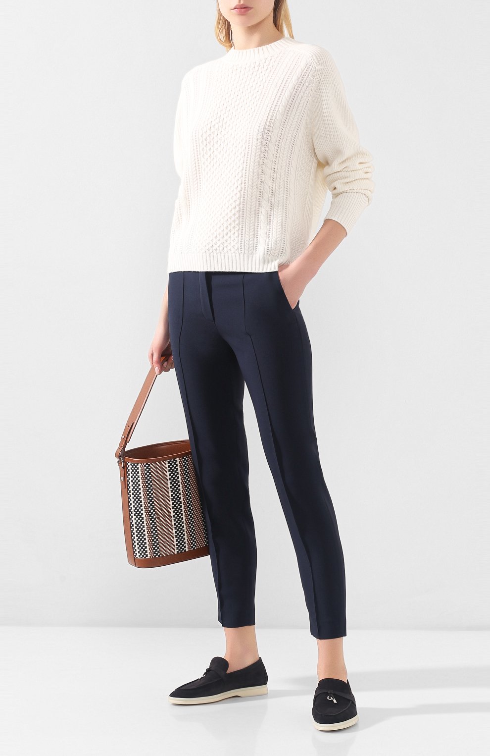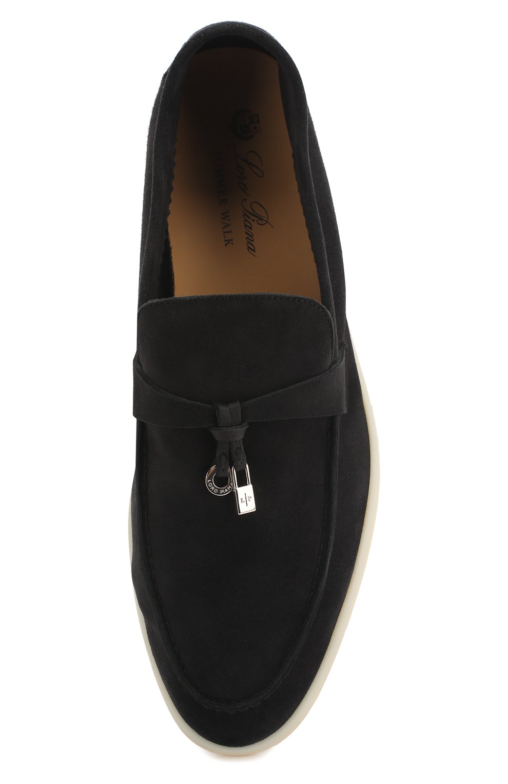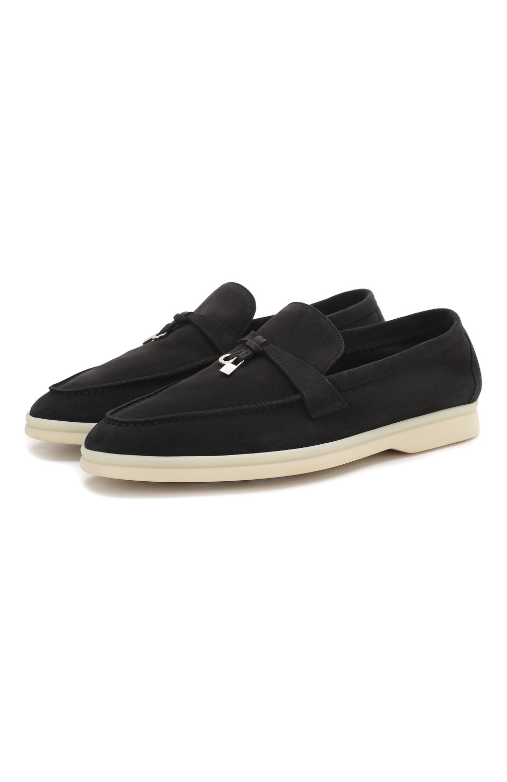 Темно-серые лоферы вошли в классическую коллекцию бренда, основанного Пьетро Лоро Пьяна. Модель сшита мастерами марки из тонкой эластичной замши. Легкая подошва из пластичного латекса переходит в низкий широкий каблук. Перемычка на союзке декорирована миниатюрными серебристыми подвесками My Charms.