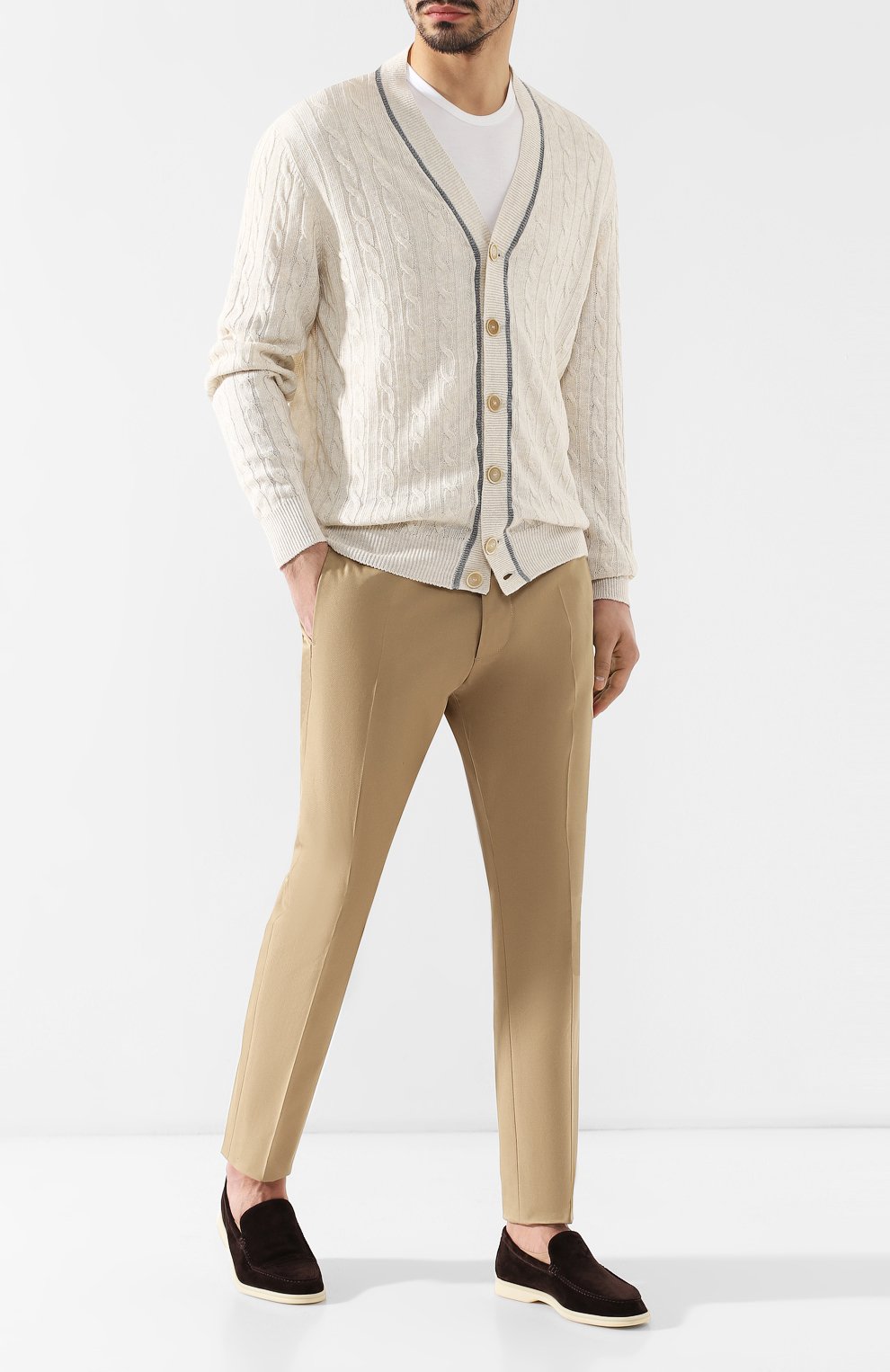 Элегантная модель на каждый день изготовлена из коричневой замши. Лоферы с зауженным мысом, на небольшом каблуке представлены в классической коллекции марки. Вырез изделия обработан замшевым кантом. Строчка в тон.