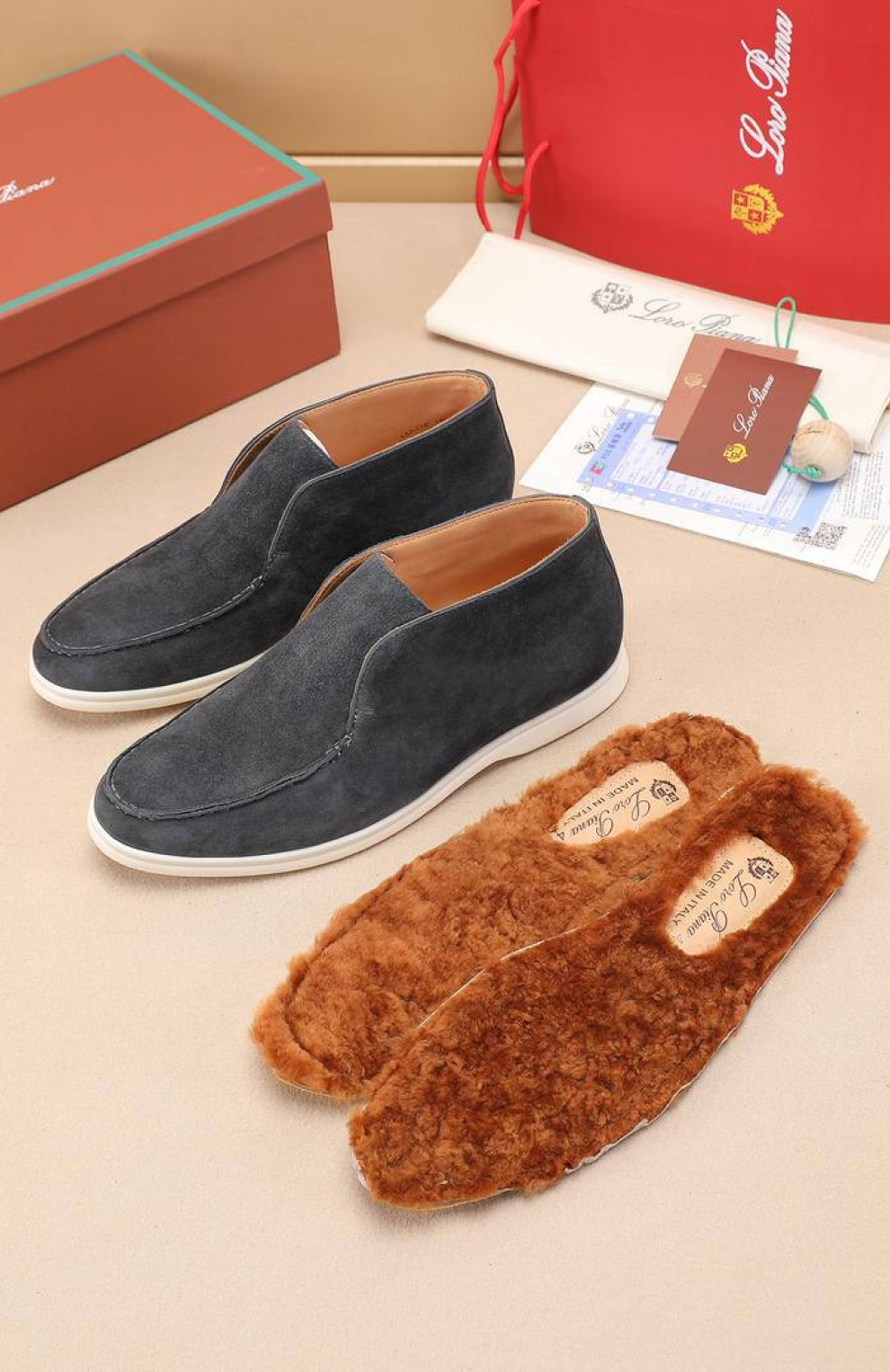 Замшевые лоферы с меховой стелькой Loro Piana Open Walk - Dark Grey
